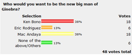 The Ginebra Gin Kings lack a big man for the upcoming PBA Governor's Cup 2011. As a Ginebra fan, who would you want to be the new big man of Ginebra? Ken Bono, Mac Andaya or Eric Rodriguez? You can voice out the reason why you want that player to be in Ginebra. Just place it in the comment box below. Thank you guys for voting. Ginebra never say die! Guys Here's the result of the old poll. The voting started from 2:00 p.m. up to 3:00 p.m. and there was a tie between Ken Bono and Big Mac Andaya. To break the tie, I made a new poll. Please vote the player that you want to be in Ginebra. The voting will start now, 3:05 p.m. and the voting will end on Friday. Here's the result of the old poll.